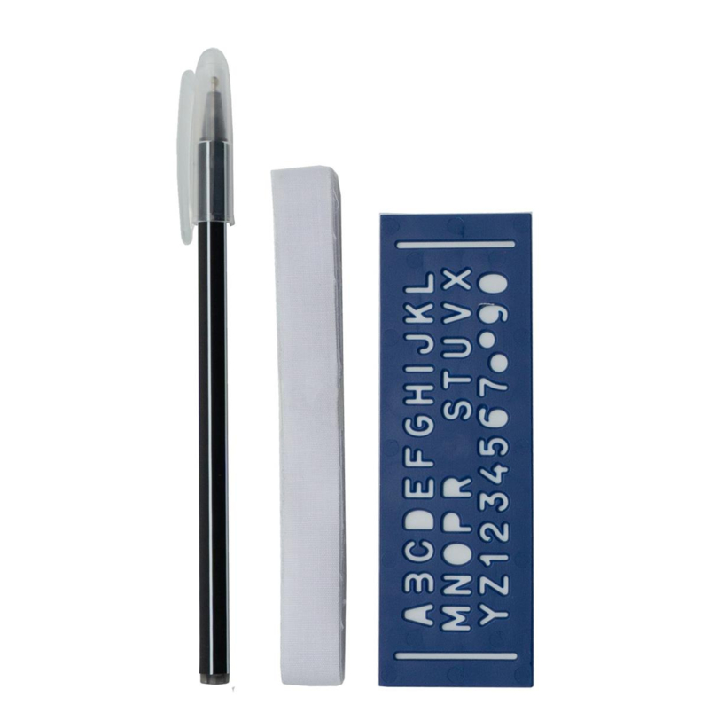 Deze set bevat 12mm opstrijkbaar band, een markeerpen en een stencil.