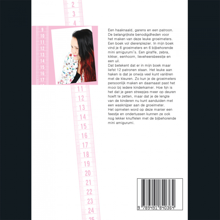 Dat betekent dat er in dit boek 12 patronen staan. Het leuke aan haken is dat je onwijs veel kunt variëren met de kleuren. Zo kun je de groeimeters persoonlijk maken en daarnaast past het mooi bij iedere kinderkamer. Hoe fijn is het dat je geen streepjes meer op deuren hoeft te zetten, maar dat je de lengte van de kinderen nu kunt aanduiden met een wasknijper aan d egroeimeter. Het opmeten wordt op deze manier een feestje en ondertussen kunnen ze ook nog lekker knuffelen met de bijbehorende mini amigurumi.