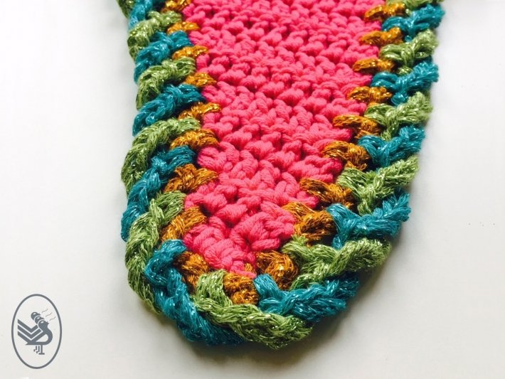 De rand van deze sjaal wordt met dubbele draad gehaakt. Neem twee bollen of maak halve bollen. Je kunt ook de begin- en einddraad van de bol gebruiken.