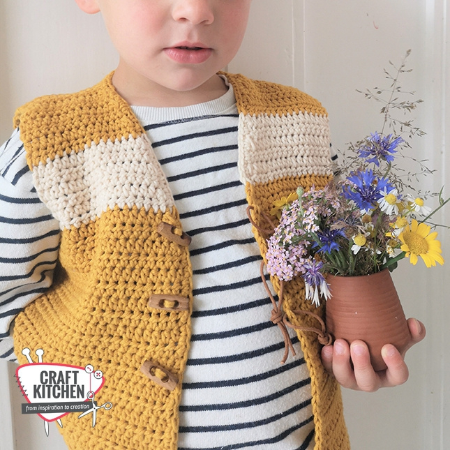 OverzichtJanneke: 'Een stoer mouwloos kindervestje, fijn voor de net wat frissere dagen. Ik vind het leuk om het open te dragen, lekker nonchalant. Maar mocht je het vestje dicht willen dragen dan kun je er optioneel leerkoordjes aanknopen, om het knoopje doorheen te halen. Extra persoonlijk maak je het door de naam van het kindje op de rug te borduren.'