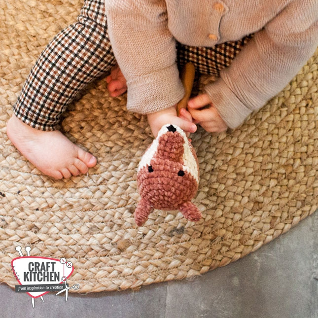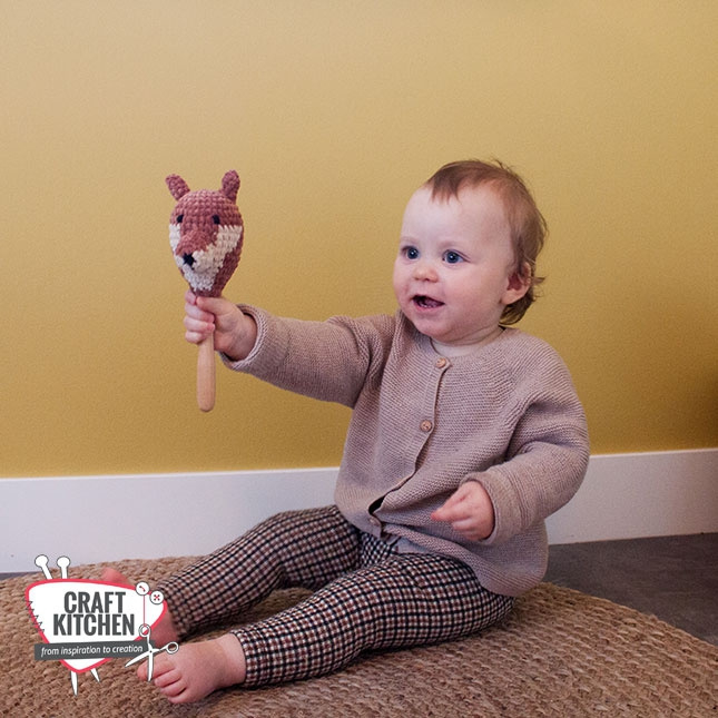 Anneke: 'Deze rammelaar is leuk om als kraamcadeau te geven. Het kopje voelt heerlijk zacht aan door het Velvet garen. De oren en snoet die uitsteken zijn rond en leuk om aan te zitten voor een baby.'
