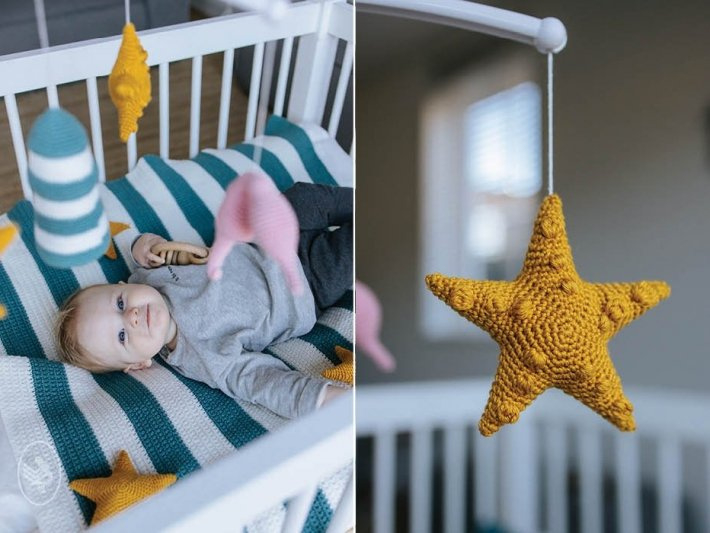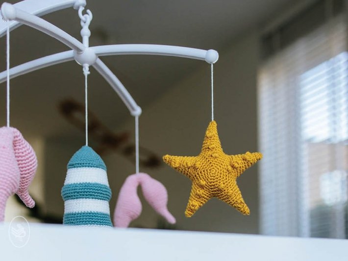 Met deze mobiel heeft jouw kindje een mooi uitzicht op allerlei figuren die met de zee en het strand te maken hebben. De mobiel bestaat uit drie patronen: een vuurtoren, een zeester en een zeepaardje. Alle figuren zijn met de amigurumi techniek in spiraaltoeren gehaakt.