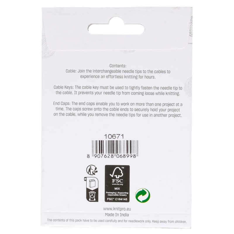 Artikelnummer: 10671 OverzichtRondbreien gaat makkelijk en soepel met de Swivel verwisselbare kabel van KnitPro. Door het Swivel 360° systeem kunnen de breinaaldpunten ongehinderd ronddraaien, wat voorkomt dat de kabel tijdens het breien gaat knikken of kronkelen. De stalen kabel is omhuld met een laagje nylon. Hierdoor is de kabel stevig, maar glijdt hij toch moeiteloos door de steken. De kabels zijn aan de uiteinden voorzien van een schroefgedeelte met een gaatje waarin het kabelsleuteltje past. Hiermee kunt u de naaldpunt aan de kabel bevestigen. De gaatjes zijn ook handig voor het aanbrengen van een hulpdraad (of lifeline) in het breiwerk om het werk veilig uit te halen of om gevallen steken op te halen. Met behulp van de einddoppen verandert u een verwisselbare kabel in een rechte naald of stekenhouder. Deze kabel is te gebruiken met alle verwisselbare naaldpunten van KnitPro. Elke kabel wordt geleverd met één kabelsleuteltje en twee einddoppen. De kabel en de einddoppen zijn zwart van kleur en de kabel heeft zilverkleurige schroefgedeeltes. Verkrijgbaar in verschillende maten voor een totale lengte, inclusief naaldpunten, van 40-150cm.