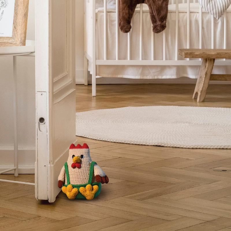 Samen zijn ze de perfecte hulpjes. De kip houdt de deur open en de vos zorgt dat tocht buiten blijft. Het deuren duo wordt gehaakt met Durable Cosy fine.