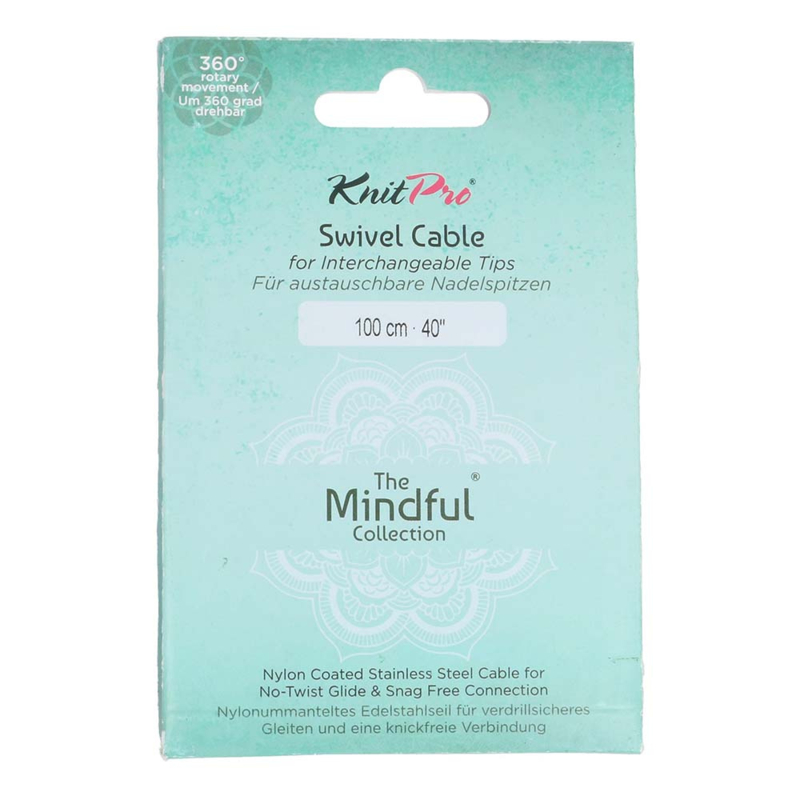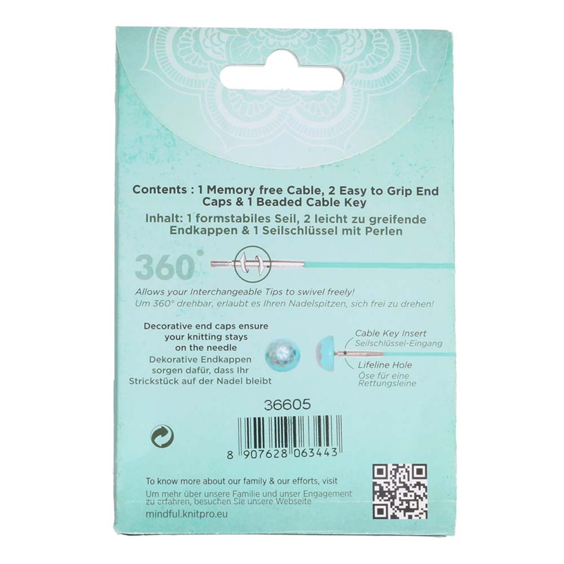 Door het Swivel 360° systeem kunnen de breinaaldpunten ongehinderd ronddraaien, wat voorkomt dat de kabel tijdens het breien gaat knikken of kronkelen. De stalen kabel is omhuld met een laagje nylon. Hierdoor is de kabel stevig, maar glijdt hij toch moeiteloos door de steken. De kabels zijn aan de uiteinden voorzien van een gaatje waarin het kabelsleuteltje past waarmee de naaldpunt aan de kabel wordt bevestigd. De gaatjes zijn ook handig voor het aanbrengen van een hulpdraad (of lifeline) in het breiwerk om het werk veilig uit te halen of om gevallen steken op te halen. De verwisselbare kabels zijn uitgevoerd in de blauwgroene kleur die karakteristiek is voor de Mindful collectie. Ook zijn er zorgvuldige details in verwerkt, zoals het blauwgroene bolletje aan de kabelsleutel en de blauwgroene einddoppen met bloempatroon. Met behulp van de einddoppen verandert u een verwisselbare kabel in een rechte naald of stekenhouder. Elke kabel wordt geleverd met één kabelsleuteltje en twee einddoppen. Verkrijgbaar in verschillende maten voor een totale lengte, inclusief naaldpunten, van 40-150cm.