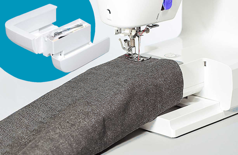 A. Standaard naaivoet B. Ritsvoet C.Knoopsgatenvoet D. Knoopaanzetvoet E. L-vormige schroevendraaier F. Garenpen viltje G. Tornmes/borsteltje H. 3 Spoelen I. Quiltgeleider J. Garenklos tegenhouder K. Extra garenpen L. Naaldenset