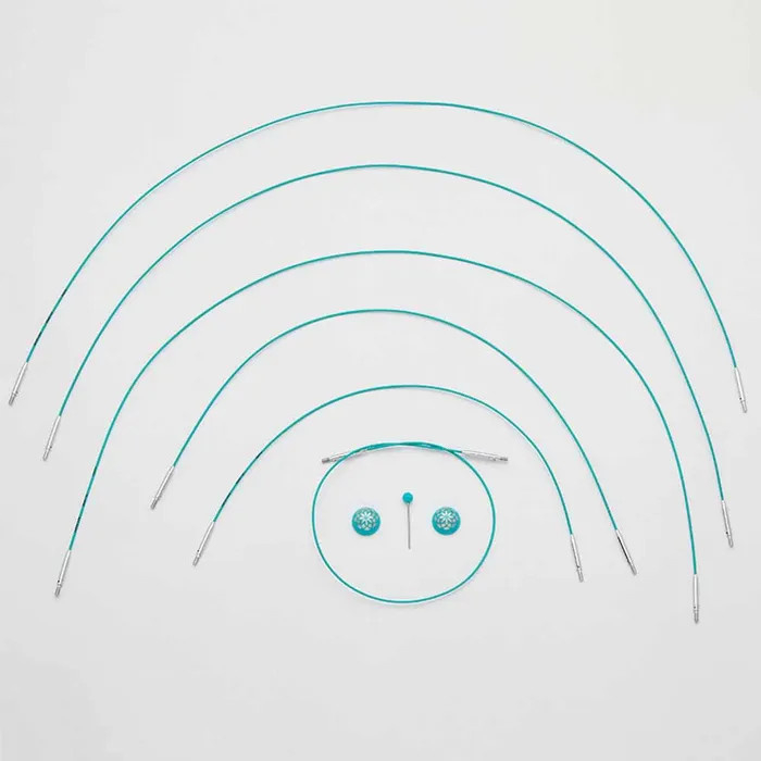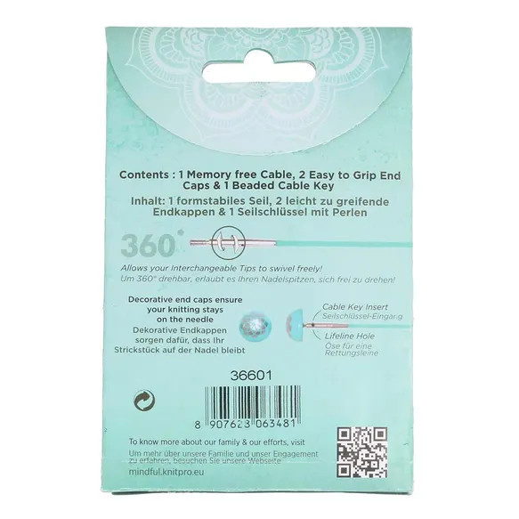 Door het Swivel 360° systeem kunnen de breinaaldpunten ongehinderd ronddraaien, wat voorkomt dat de kabel tijdens het breien gaat knikken of kronkelen. De stalen kabel is omhuld met een laagje nylon. Hierdoor is de kabel stevig, maar glijdt hij toch moeiteloos door de steken. De kabels zijn aan de uiteinden voorzien van een gaatje waarin het kabelsleuteltje past waarmee de naaldpunt aan de kabel wordt bevestigd. De gaatjes zijn ook handig voor het aanbrengen van een hulpdraad (of lifeline) in het breiwerk om het werk veilig uit te halen of om gevallen steken op te halen. De verwisselbare kabels zijn uitgevoerd in de blauwgroene kleur die karakteristiek is voor de Mindful collectie. Ook zijn er zorgvuldige details in verwerkt, zoals het blauwgroene bolletje aan de kabelsleutel en de blauwgroene einddoppen met bloempatroon. Met behulp van de einddoppen verandert u een verwisselbare kabel in een rechte naald of stekenhouder. Elke kabel wordt geleverd met één kabelsleuteltje en twee einddoppen.