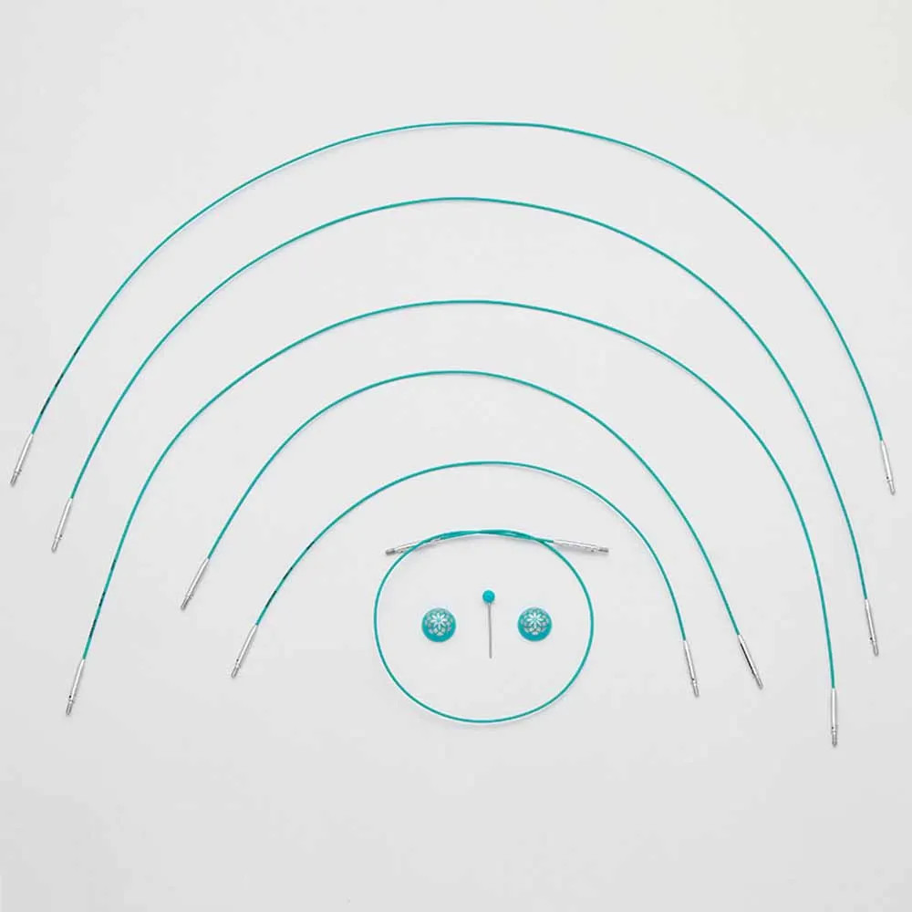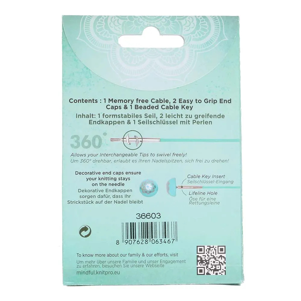 Door het Swivel 360° systeem kunnen de breinaaldpunten ongehinderd ronddraaien, wat voorkomt dat de kabel tijdens het breien gaat knikken of kronkelen. De stalen kabel is omhuld met een laagje nylon. Hierdoor is de kabel stevig, maar glijdt hij toch moeiteloos door de steken. De kabels zijn aan de uiteinden voorzien van een gaatje waarin het kabelsleuteltje past waarmee de naaldpunt aan de kabel wordt bevestigd. De gaatjes zijn ook handig voor het aanbrengen van een hulpdraad (of lifeline) in het breiwerk om het werk veilig uit te halen of om gevallen steken op te halen. De verwisselbare kabels zijn uitgevoerd in de blauwgroene kleur die karakteristiek is voor de Mindful collectie. Ook zijn er zorgvuldige details in verwerkt, zoals het blauwgroene bolletje aan de kabelsleutel en de blauwgroene einddoppen met bloempatroon. Met behulp van de einddoppen verandert u een verwisselbare kabel in een rechte naald of stekenhouder. Elke kabel wordt geleverd met één kabelsleuteltje en twee einddoppen. Verkrijgbaar in verschillende maten voor een totale lengte, inclusief naaldpunten, van 40-150cm.