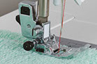 The dual upper feed dogs can be installed and removed in a single step. The dual-feed design prevents uneven feeding and bunched stitching.